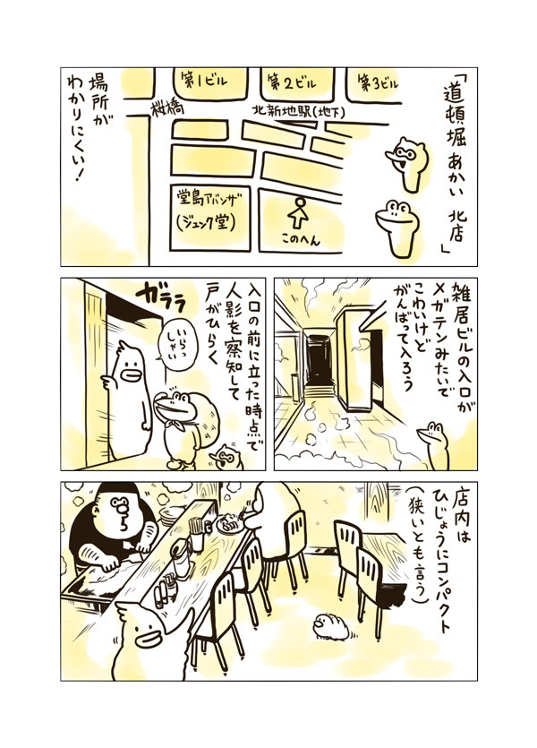 2013-11-24 やりますねぇ!北新地の穴場でご飯おかわり自由の1000円ステーキランチを食べる レポまんが ゆかい食堂 大阪・北新地にある、"大和肉鶏と博多風水炊きの店"「道頓堀あかい 北店」に行ってきました。 最近できた新店舗のようですね。よかったです。 リンク ぐるなび - 道頓堀あかい 北店 道頓堀 あかい 北店 - 北新地/水炊き [食べログ]